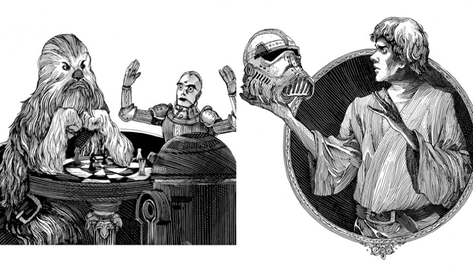 The adult Shakespeare lover in my admired Doescher’s ability to stick to some of Lucas’ original words while giving them a Shakespearean make-over. But the biggest surprise and delight came from Doescher’s novel idea to place Shakespeare-like asides and soliloquies in key moments. These monologs offers Star Wars fans new vantage points to view the characters and their motivations. Take Luke’s inner struggle after finding his aunt and uncle’s chard remains: